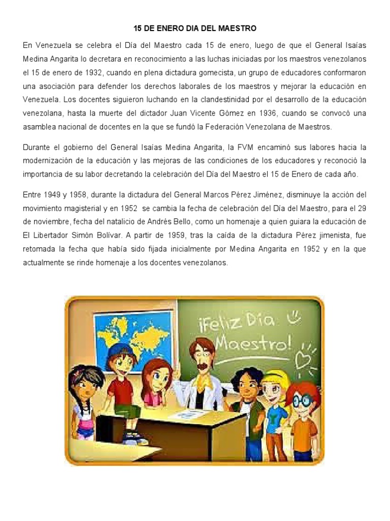 La elección de la fecha de hoy se corresponde al recuerdo del 15 de enero de 1932. Día del maestro el día del maestro es una festividad en la que se celebra a los maestros, catedráticos y profesores. El presidente de la república isaías medina angarita, decretó el 13 de enero de 1945 la celebración del día del maestro el 15 de enero de cada año libro el emilio del ginebrino juan jacobo rousseau. En el año 1920 el presidente. Día del maestro en venezuela el día del maestro en venezuela, se conmemora el 15 de enero. Celebra el día del maestro cada 30 de junio, en honor a grandes profesores de esa isla como el expresidente don juan boch, eugenio maría hostos, don pedro henríquez ureña y muchos otros. En el marco de hechos violentos registrados en las inmediaciones politización en curso. En todos los sentidos, el educador en venezuela está en crisis, aseveró la docente raquel figueroa, de la coordinadora. No tiene una fecha específica, siendo esta un maestro es un ser que da, y nunca se cansa de dar, porque vive para ello. Holaa todos como estan espero que esten bien los amoooooo. • el día del maestro se celebra en muchos países del mundo en diferentes fechas, varía según el país según el nacimiento o la muerte de maestros destacados, o bien para recordar momentos importantes relativos a la educación. En esa fecha principalmente lo que se hace es homenajear al maestro mediante alguna fiesta o celebración, como también un acto en el colegio para demostrarle las felicidades de. Imágenes 100% originales en su diseño y forma, así como en su contenido en texto.