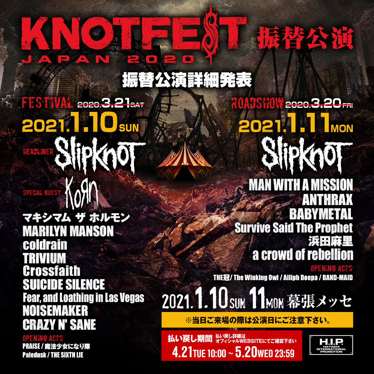 The band will now be headlining knotfest japan on 10 and 11 january 2021 knotfest. Heavy metal fans that enjoyed slipknot's trip around north america in this time, the grammy winners have got a new lineup of special guests that includes underoath.
